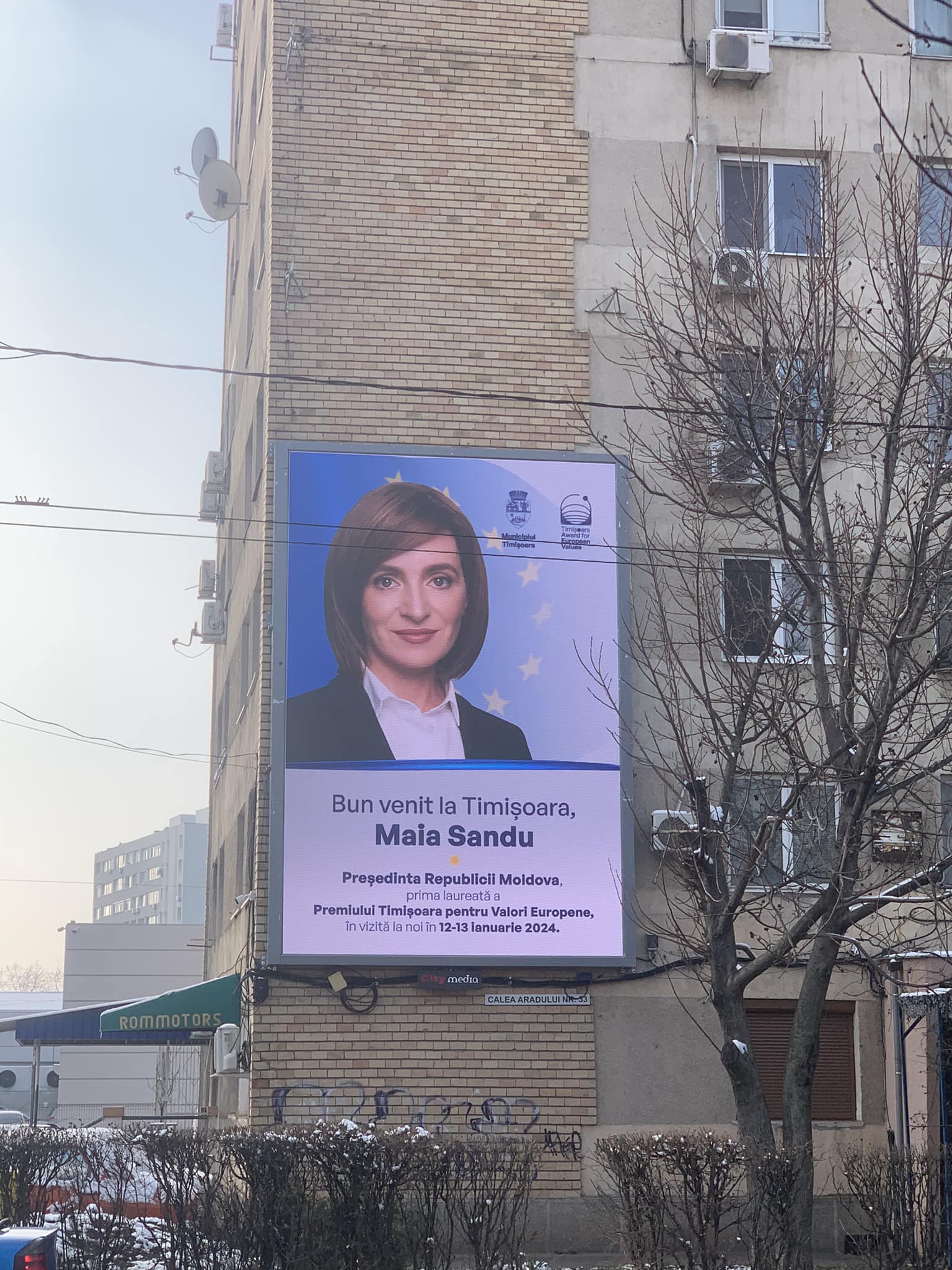 Potrivit unor imagini de pe rețelele de socializare, Primăria Timișoara a pregătit mai multe bannere imense cu poza Maiei Sandu, iar unul dintre acestea, care seamănă cu un panou electoral, a fost plasat pe o clădire din oraș.