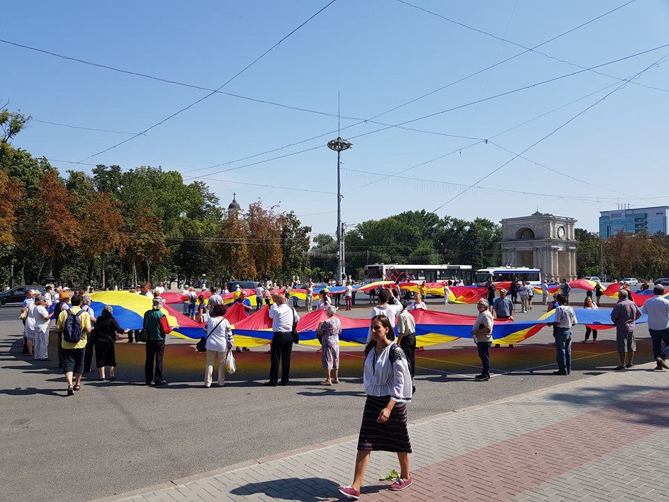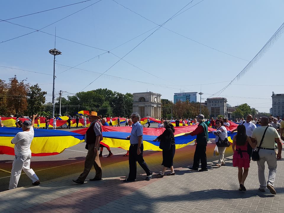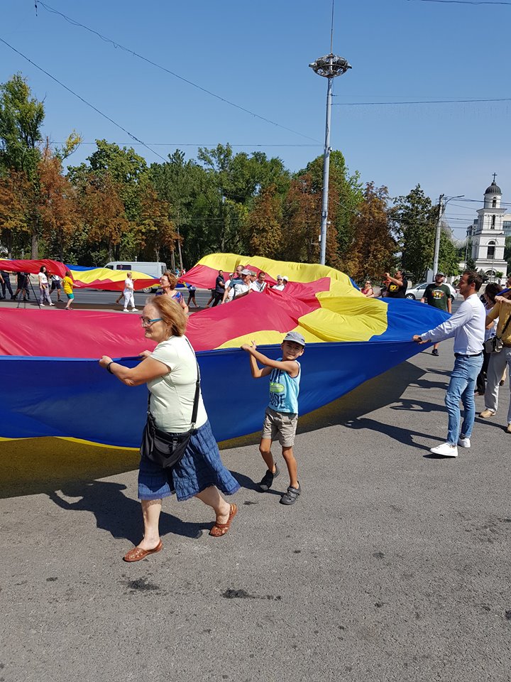Cei prezenți au desfăcut un tricolor uriaș în centrul Chișinăului și au scandat: „Unire” sau „România nu a avut graniță la Prut”.