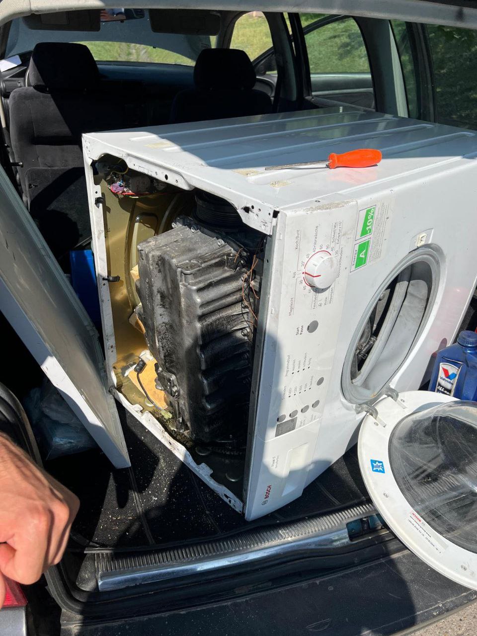 FOTO // „Mașină de spălat cu VALVE” – noua găselniță a unui moldovean. Bărbatul a camuflat un MOTOR de automobil într-o mașină de spălat veche, pe care a încercat să-l introducă fraudulos în R. Moldova