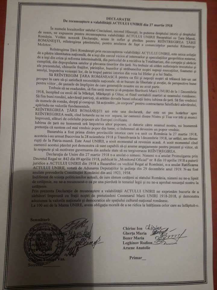 Veaceslav Arapan UPDATE // În ultimele ore, alte trei localități au semnat Declarația de Unire cu România - Tănătari din Căușeni, Sinești din Ungheni și Păulești din Călărași.