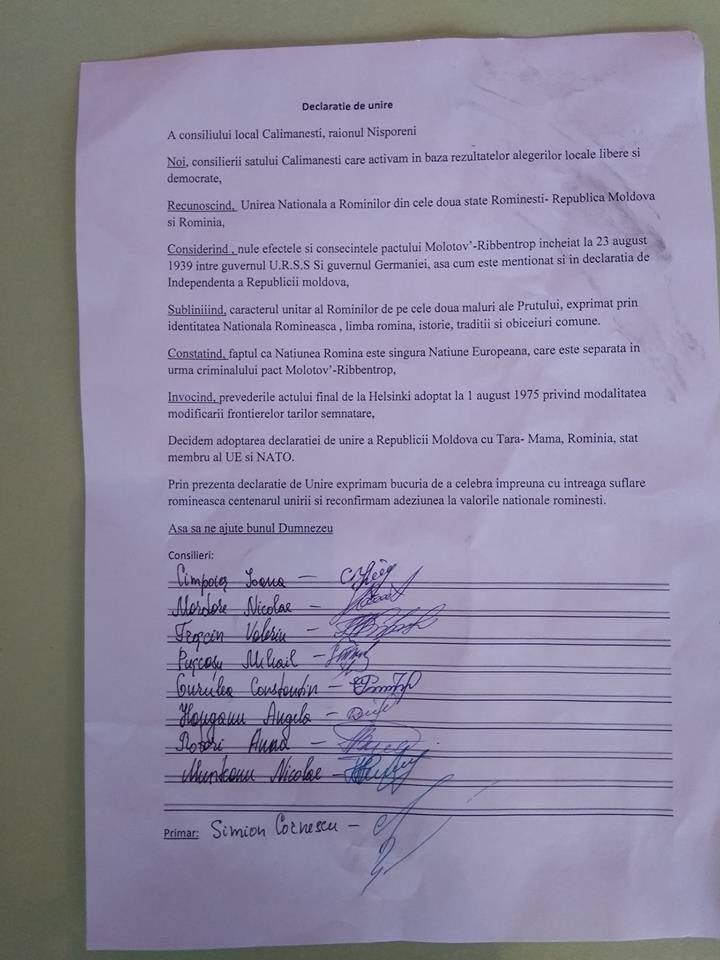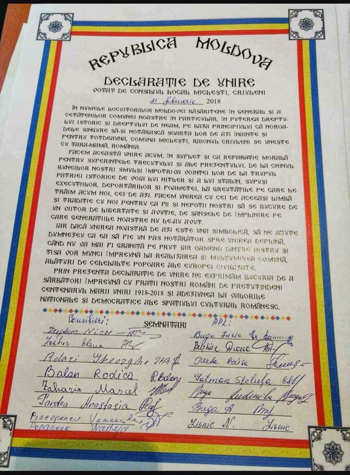 În declarația semnată de primarul și consilierii de la Colonița, baștina lui Gheorghe Ghimpu, cel care a făcut șase ani de închisoare în Gulag, pe timpul sovieticilor, și care arborat primul tricolor pe clădirea Parlamentului din Moldova, se arată că „moldovenii, muntenii și ardelenii sunt parte a poporului și națiunii române, vorbesc aceeași limbă, au aceeași istorie, tradiție și cultură, fapt confirmat prin Unirea de la 1600, înfăptuită de Mihai Viteazul, prin Mica Unire de la 1859, înfăptuită de Alexandru Ioan Cuza și prin Marea Unire de la 1918, înfăptuită de românii din Basarabia, Bucovina și Transilvania”.