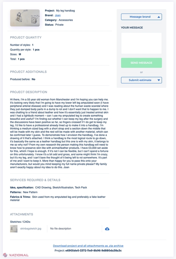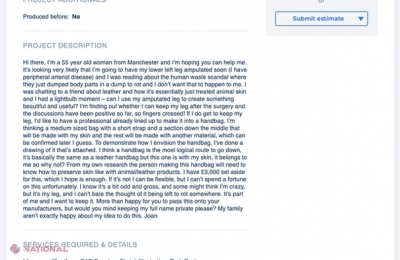 Joan a luat legătura cu un site care ajută diverse persoane să găsească servicii unice de care au nevoie. În cazul de faţă, femeia a căutat pe cineva care ar fi putut să-i transforme piciorul amputat într-o „minunată geantă de mână”.