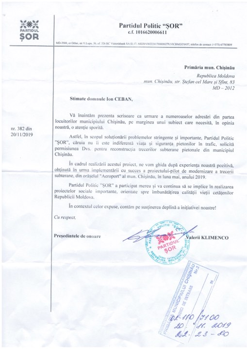 Sursa citată amintește că, în primăvara anului curent, Partidul „ȘOR” s-a implicat direct, la solicitarea locuitorilor capitalei, în modernizarea unui pasaj subteran din regiunea Aeroportului. „Lăsată de izbeliște de mai mulți ani, trecerea subterană din vecinătatea unui liceu, a fost reabilitată în termeni record în cadrul unui proiect realizat de Partidul „ȘOR”. Atunci, liderul formațiunii politice, Ilan Șor, a anunțat că la Primăria Chișinău a fost depus un demers în care a fost solicitată permisiunea de a reconstrui toate pasajele subterane din sectorul Botanica. Autoritățile municipale de atunci nu au dat însă curs inițiativei”, se mai arată în comunicatul de presă.