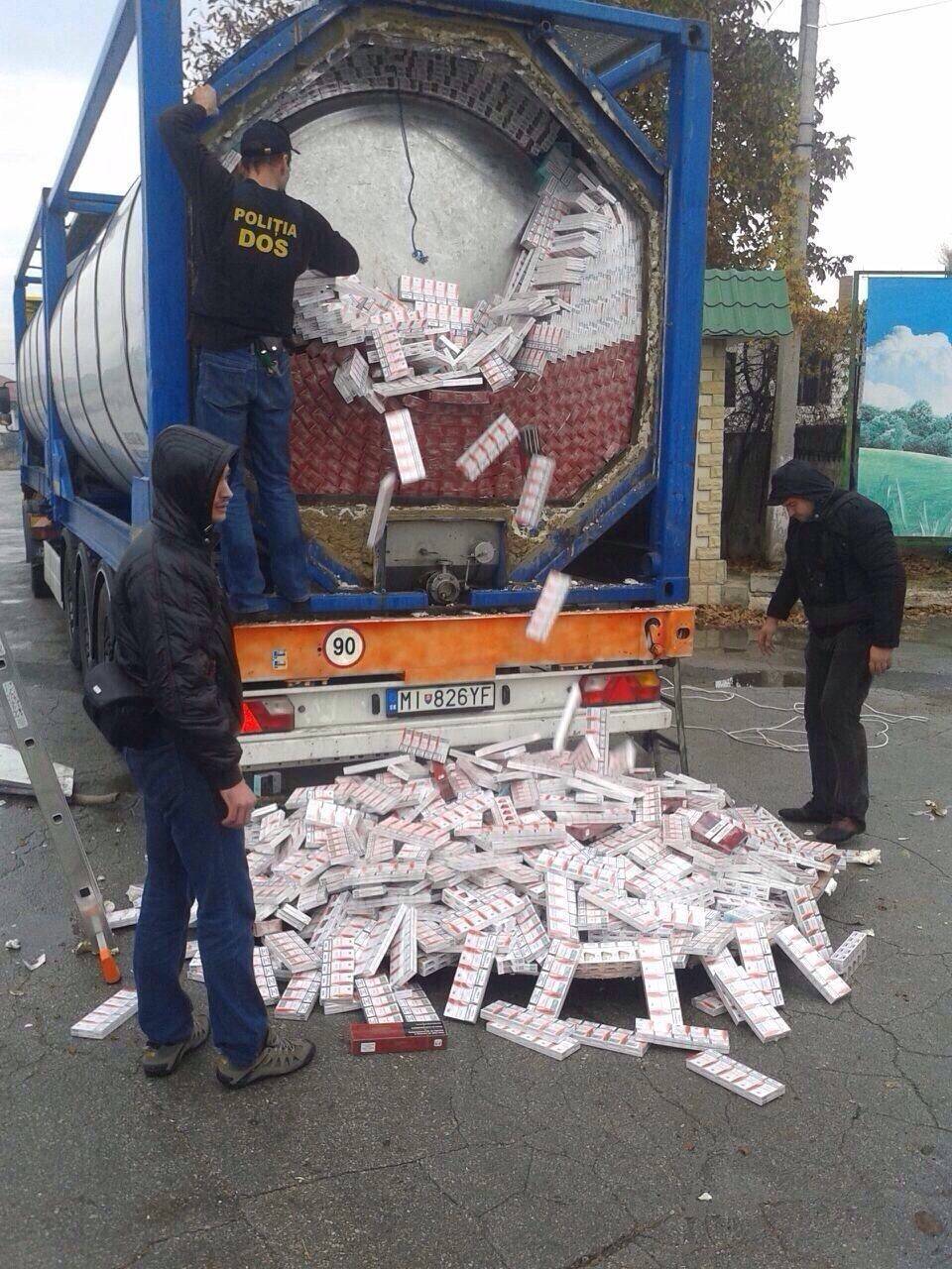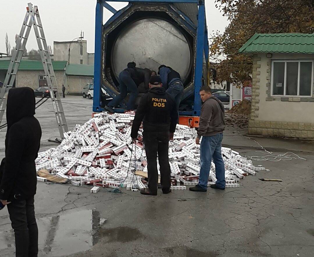 În pereții cisternelor, oamenii legii au descoperit mii de pachete cu țigări de contrabandă, ajunse în R. Moldova din Ucraina prin Transnistria și care urmau să ajungă în România, iar de acolo - pe piața neagră a Uniunii Europene.