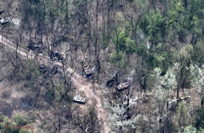 Întreaga zonă de lângă râu este plină de tancuri rusești distruse, transportoare blindate, mitraliere cu țevi răsucite în spirale și rămășițe carbonizate ale soldaților ruși.