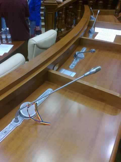 Când îşi va ocupa locul în Parlament, liderul comuniştilor Vladimir Voronin îşi va găsi microfonul legat cu o panglică tricoloră. Asta dacă angajaţii Legislativului nu o vor scoate până la şedinţa următoare în plen.