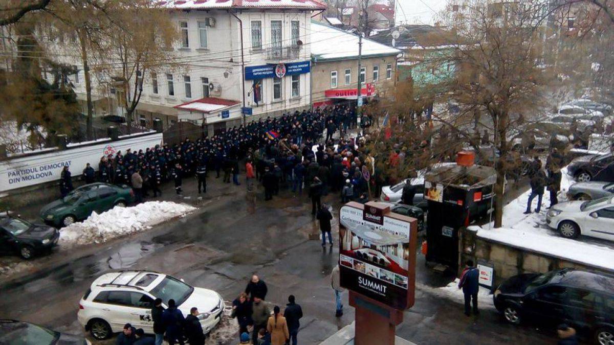 Aceștia au ajuns aici, imediat ce protestatarii Platformei „Demnitate și Adevăr”, care au manifestat la Președinție împotriva desemnării unui candidat democrat la funcția de premier, scandând: „Fiți cu poporul, nu cu infractorul!”, au anunțat că merg să pichedeze sediul democraților.