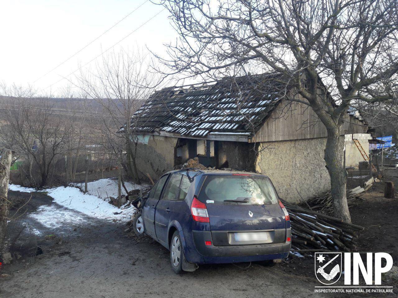 FOTO // Un șofer urmărit de Poliție pentru că circula cu viteză excesivă prin Cimișlia și-a sfârșit cursa intrând cu mașina într-o casă