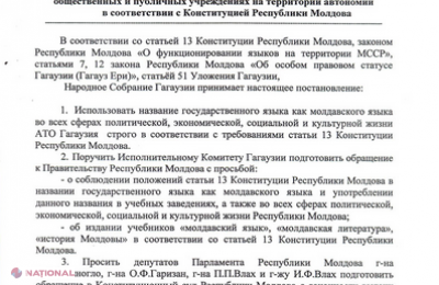 După ce Adunarea Populară de la Comrat a decis ca limba română să fie interzisă în toate instituțiile publice și de învățământ din regiune, găgăuzii au trimis o solicitare Guvernului în care cer să le fie respectată această decizie.