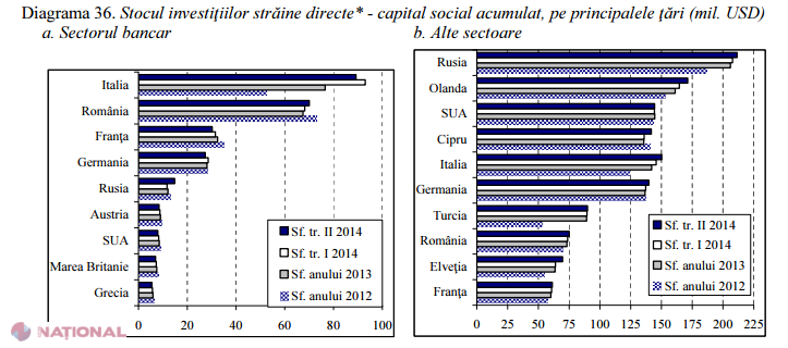 Cei mai mulți investitori străini vin din UE cu o pondere de 52,7 %, care a crescut pe parcursul trimestrului cu 0,3 puncte procentuale datorită investiţiilor provenite din Austria, Olanda, Italia, România. Investitorii din ţările CSI au deţinut o pondere de 11,6 la sută în totalul capitalului social acumulat, iar celor din alte ţări – 35,7 %).