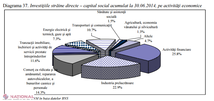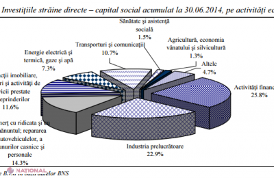 Principala activitate economică care a beneficiat de investiţii străine rămâne activitatea financiară (25,8 la sută), urmată de industria prelucrătoare (22,9 la sută). Alte activităţi care au atras investitori străini au fost comerţul, tranzacţiile imobiliare, transporturile şi telecomunicaţiile, industria energetică.