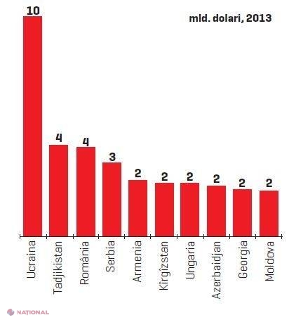 Potrivit unui grafic elaborat de sursă, România se situează pe locul trei după volumul de remitențe primit în 2013, care este estimat de Banca Mondială (BM) la circa patru miliarde de dolari. În fruntea clasamentului se poziționează Ucraina cu suma de zece miliarde de dolari, fiind urmată de Tadjikistan cu un volum al remitențelor de circa patru miliarde de dolari. La polul opus se află Azerbaidjan, Georgia și R. Moldova, care încheie clasamentul. Suma pe care au transmis-o migranții moldoveni, estimată de BM, se cifrează la mai puțin de două miliarde de dolari.