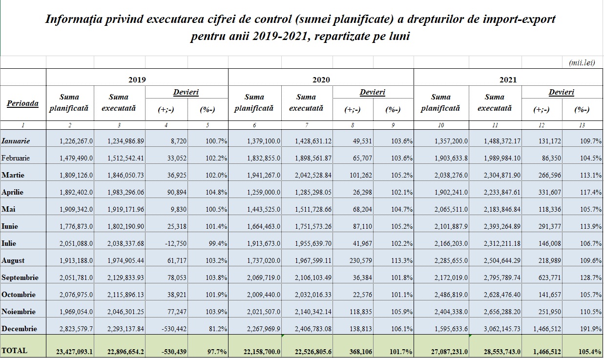 Veniturile încasate la bugetul de stat în anul 2021 de către Serviciul Vamal se ridică la peste 28,5 miliarde de lei, în creștere cu 26,8% comparativ cu anul 2020 și cu 24,9% față de anul 2019.