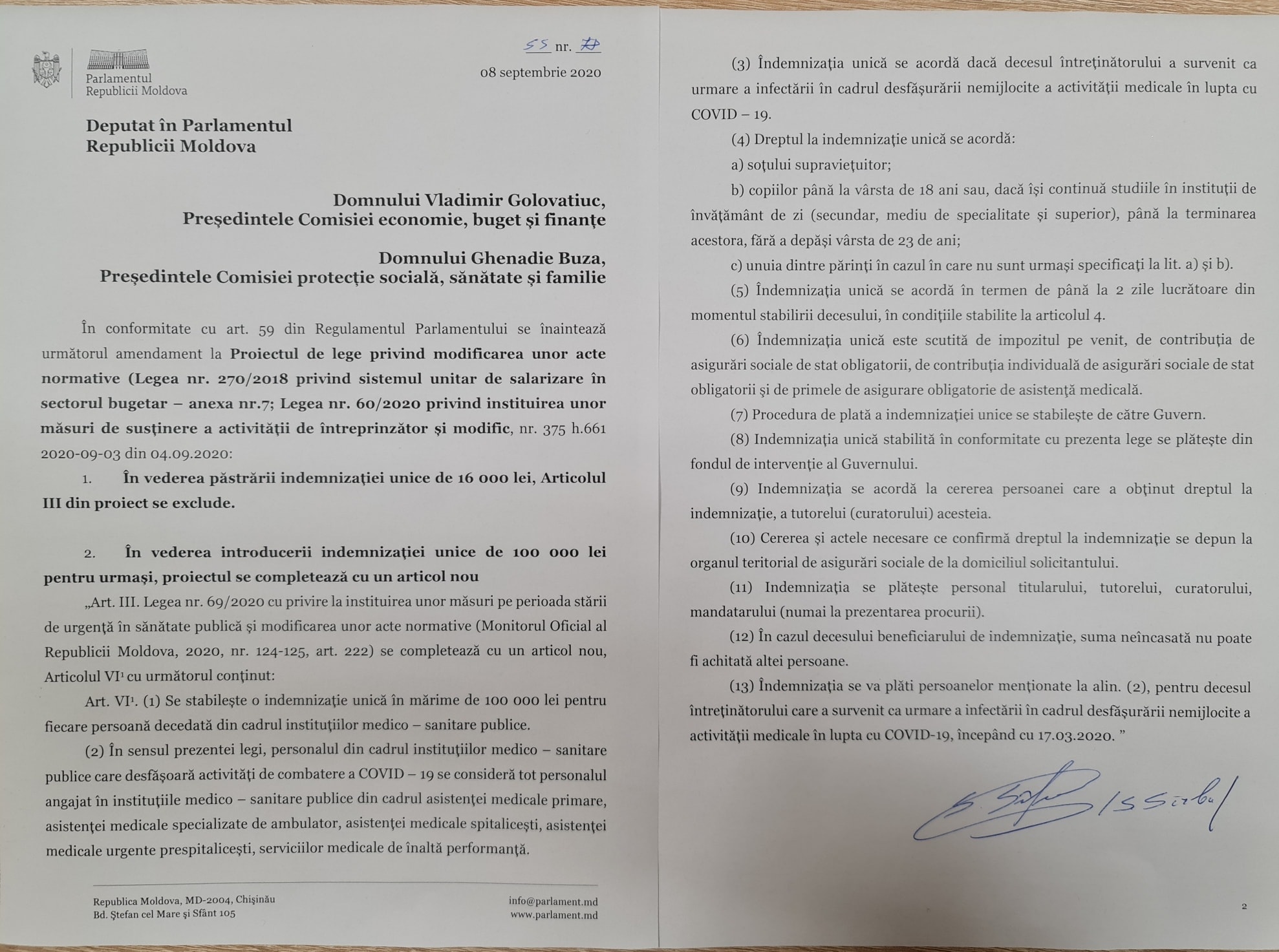 „Am depus astăzi un amendament din numele echipei „Pro Moldova”, prin care cerem lăsarea în vigoare a indemnizației de 16 000 de lei pentru toți angajații medicali din prima linie. Totodată, am cerut și introducerea unei indemnizatii de deces de 100 de mii pentru toate familiile unde a decedat un angajat al sistemului de sănătate. Mapa cu amendamente a plecat la Guvern. Hai, eroilor, arătați-ne fața voastră”, a declarat deputatul „Pro Moldova”, Sergiu Sârbu.