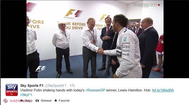 „Perla neagră a Formulei", cu casca încă pe cap, a păşit încrezător în camera în care piloţii aşteaptă să urce pe podium sub supravegherea hostesselor. Hamilton a făcut un gest vizibil de a-l evita pe oficialul rus, însă şi-a făcut timp pentru un salut cu Bernie Ecclestone, contestatul patron al Formulei 1, aflat la mai puţin de un metru de Putin, şi apoi cu reprezentantul BMW. Protocolul l-a obligat însă pe Hamilton să dea mâna cu Vladimir Putin la câteva minute distanţă, întrucât Vladimir Putin a înmânat cupa câştigătorului primei curse de la Soci din istoria Marelui Circ.
