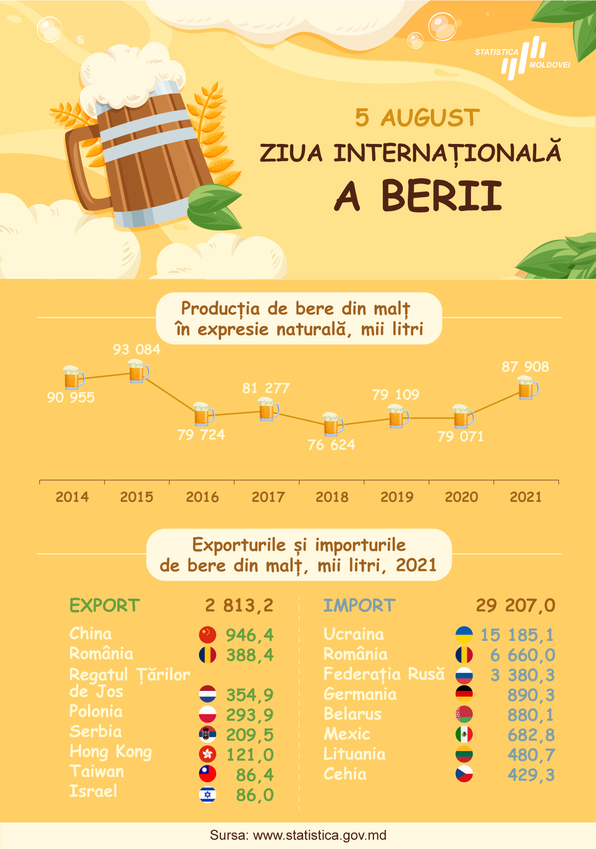 Datele Biroului Național de Statistică, făcute publice de Ziua Internațională a Berii, marcată pe 5 august, circa 2,8 milioane de litri din această cantitate le-am exportat.