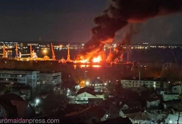 VIDEO // Atac spectaculos al Ucrainei în portul Feodosia din Crimeea: A lovit nava de asalt amfibiu Novocherkask care ar fi transportat drone iraniene