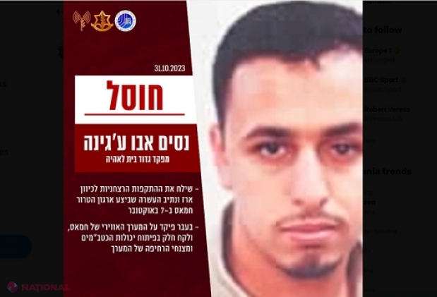 Armata israeliană anunţă că l-a ucis în nordul Fâşiei Gaza pe comandantul Batalionului Beit Lahiya al Hamas, Nisam Abu Ajina, conducătorul atacurilor de la 7 octombrie în kibuţurile Erez şi Netiv Ha'asara