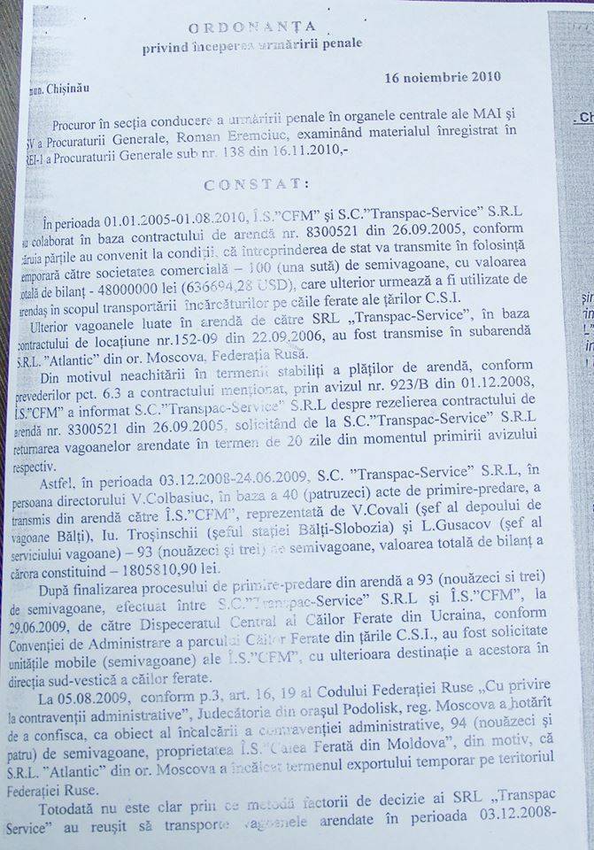 Procurorii și-au argumentat acuzațiile prin faptul că firma ar fi transmis vagoanele în subarendă unor companii din Rusia, câștigând din această tranzacție 75 de milioane de lei, cu 20 de milioane mai mult decât suma plătită CFM. Mai mult, fiind exportator de servicii în locul CFM, agentul economic a beneficiat de restituirea TVA din bugetul de stat în mărime de 11 milioane de lei.
