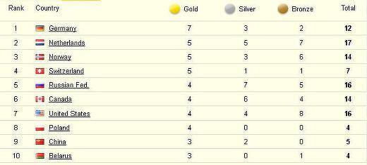 Clasamentul pe medalii a suferit schimbări majore după disputarea a patru finale de ieri. Olanda şi Norvegia au urcat pe podium, în spatele Germaniei, după titlurile olimpice câştigate la patinaj viteză, respectiv schi alpin. Olanda deţine şi cel mai mare număr de medalii - 17. „Portocalele” şi-au spulberat propriul record - 11 medalii, care data de la Nagano 1998, informează prosport.ro.