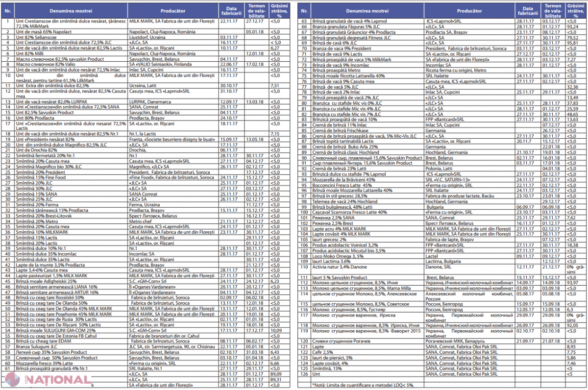Potrivit „Logos-press”, la labortaror au ajuns 126 de probe ale produselor lactate autohtone și importate, în total aparținând la 45 de fabrici din R. Moldova, Ucraina, Belarus, România, Germania, Bulgaria, Polonia, Danemarca și Filandal, cum ar fi „JLC”, „Milk Mark”, „Lactis”, „Inlac”, „Lapmol”, „Fabrica din Drochia”, „Fabrica de brinzeturi Soroca”, „Incomlac”, „Sana” etc.