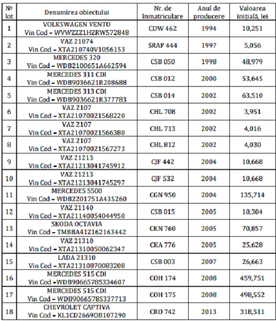 Tototdată, la licitație vor fi expuse și două mașini de marca „Mercedes”, produse în 2008, al căror preț poate depăși jumătate de milion de lei.