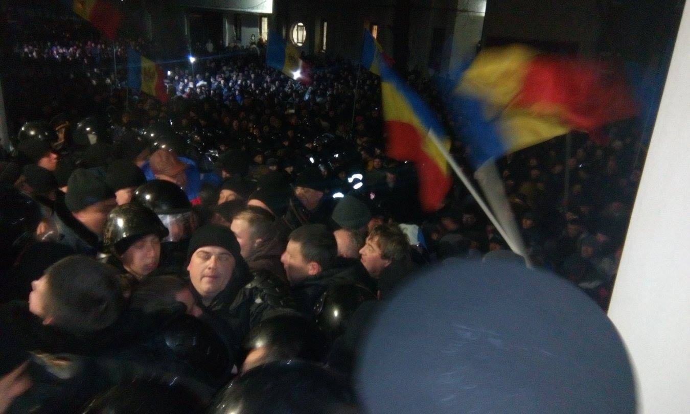 UPDATE (20.44) La Parlament și-a făcut apariția șeful Inspectoratului General de Poliție, Gheorghe Cavcaliuc, însoțit de sute de mascați. Aceștia alungă protestatarii și jurnaliștii din clădirea Parlamentului.