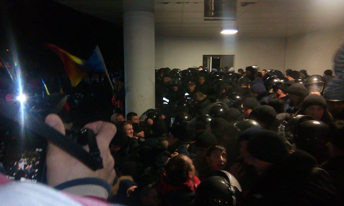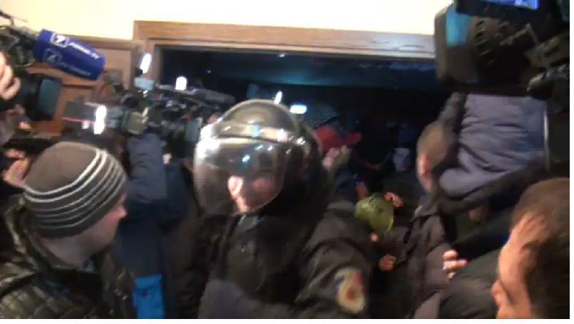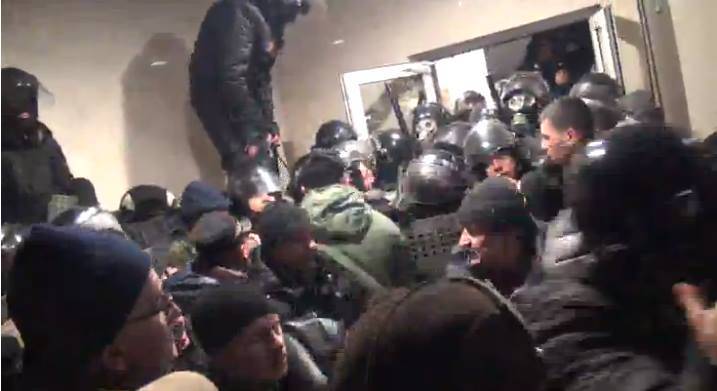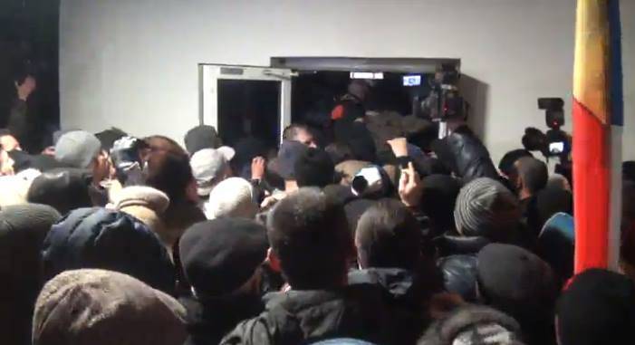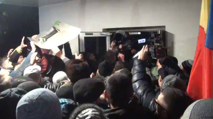 UPDATE (18.12): Ușa Parlamentului a fost spartă. Mulțimea aclamează. În interior sunt mai mulți polițiști. Protestatarii au intrat în Parlament și deposedează polițiștii de scuturi. Deja șapte scuturi sunt transmise din mână în mână de către manifestanți.