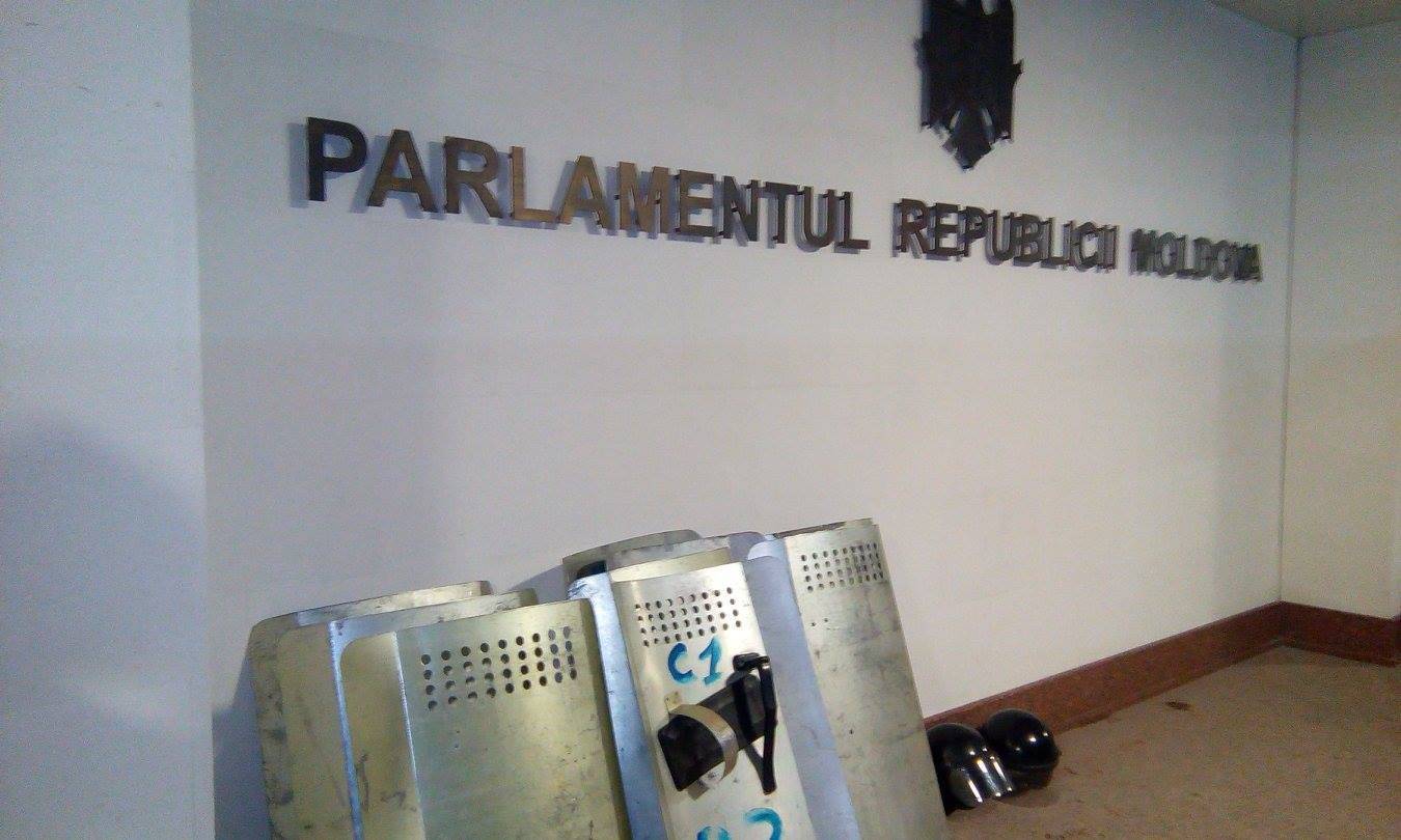 UPDATE (21.25): Polițiștii au format cordoane în jurul clădirii Parlamentului, se apără cu scuturi, iar mulțimea, dată afară din Legislativ, scandează: „Hoții!” și „Jos Plahotniuc!”.