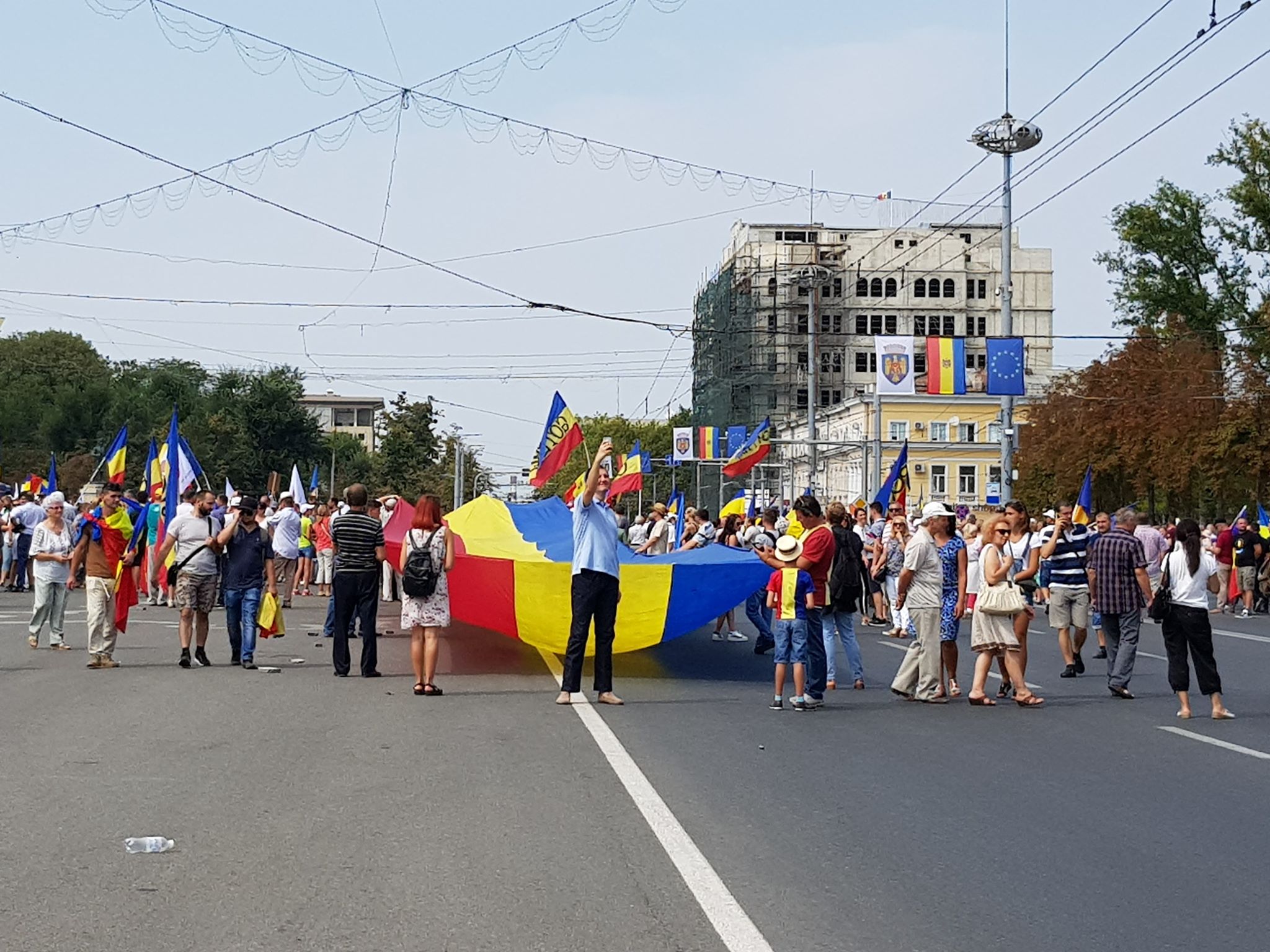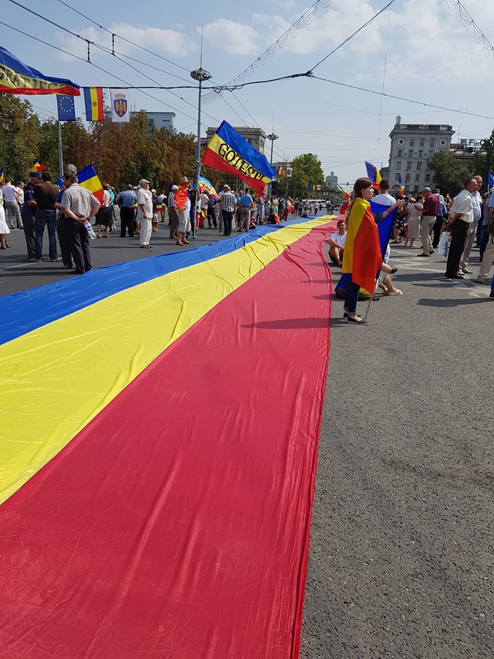 UPDATE 14.00 // Participanții la Marea Adunare Centenară au pornit în marș pe bd. Ștefan cel Mare ca să ajungă la autocarele blocate de Poliție la intrarea în Chișinău, la Bariera Sculeni. Ajunși la Ambasada Rusiei la Chișinău, aceștia au scandat: „Putin, nu uita, Basarabia nu-i a ta”, „George în țară, armata rusă afară”. Manifestanții au luat cu ei și drapelul uriaș care se întinde pe sute de metri.