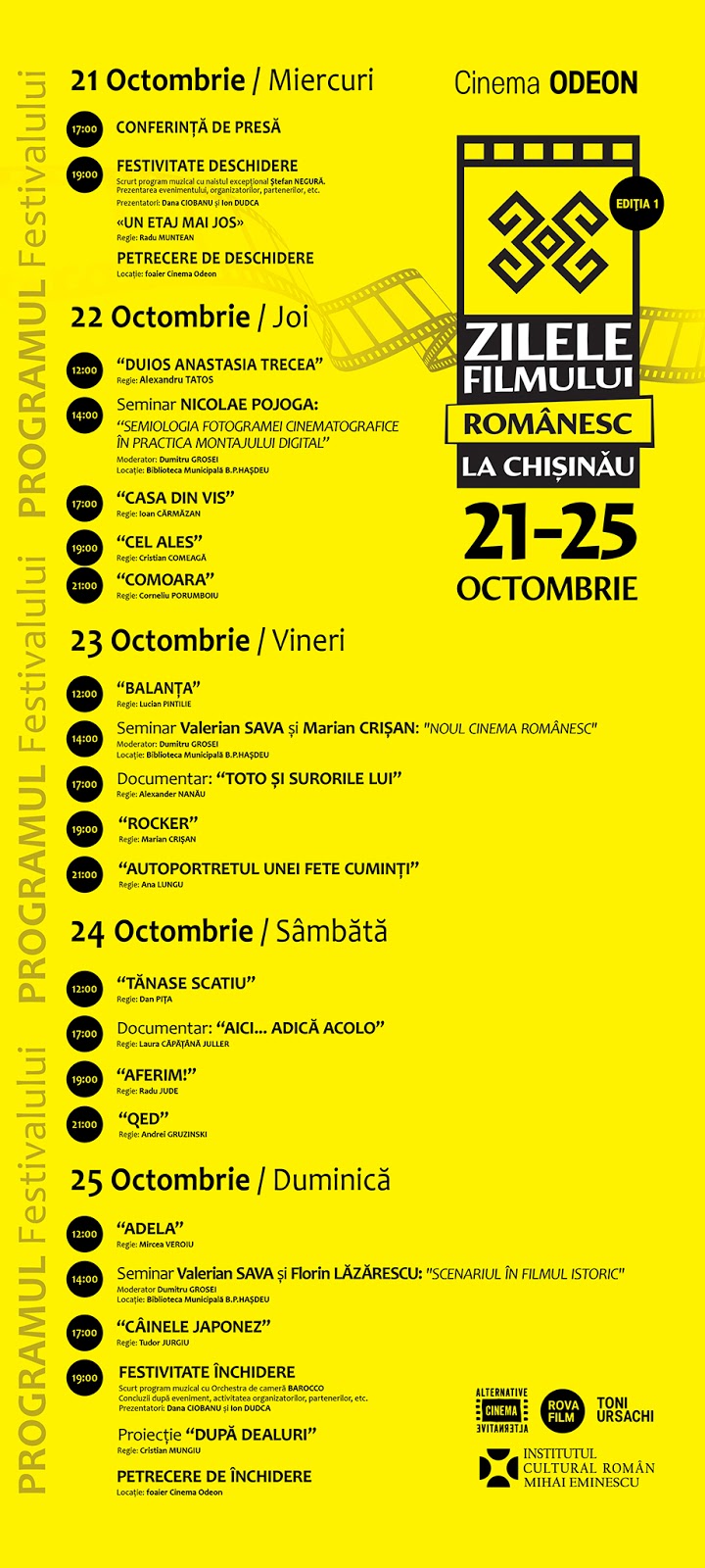 Cele mai de succes pelicule românești vor fi proiectate în cadrul unui eveniment cu genericul „Zilele filmului românesc”, care va avea loc în perioada 21-25 octombrie curent la Cinematograful „Odeon” din capitală. Festivalul este organizat de către Asociația Cineaștilor Independenți din Republica Moldova „Alternative Cinema” și compania de producție cinematografică „Rova Film” din România.