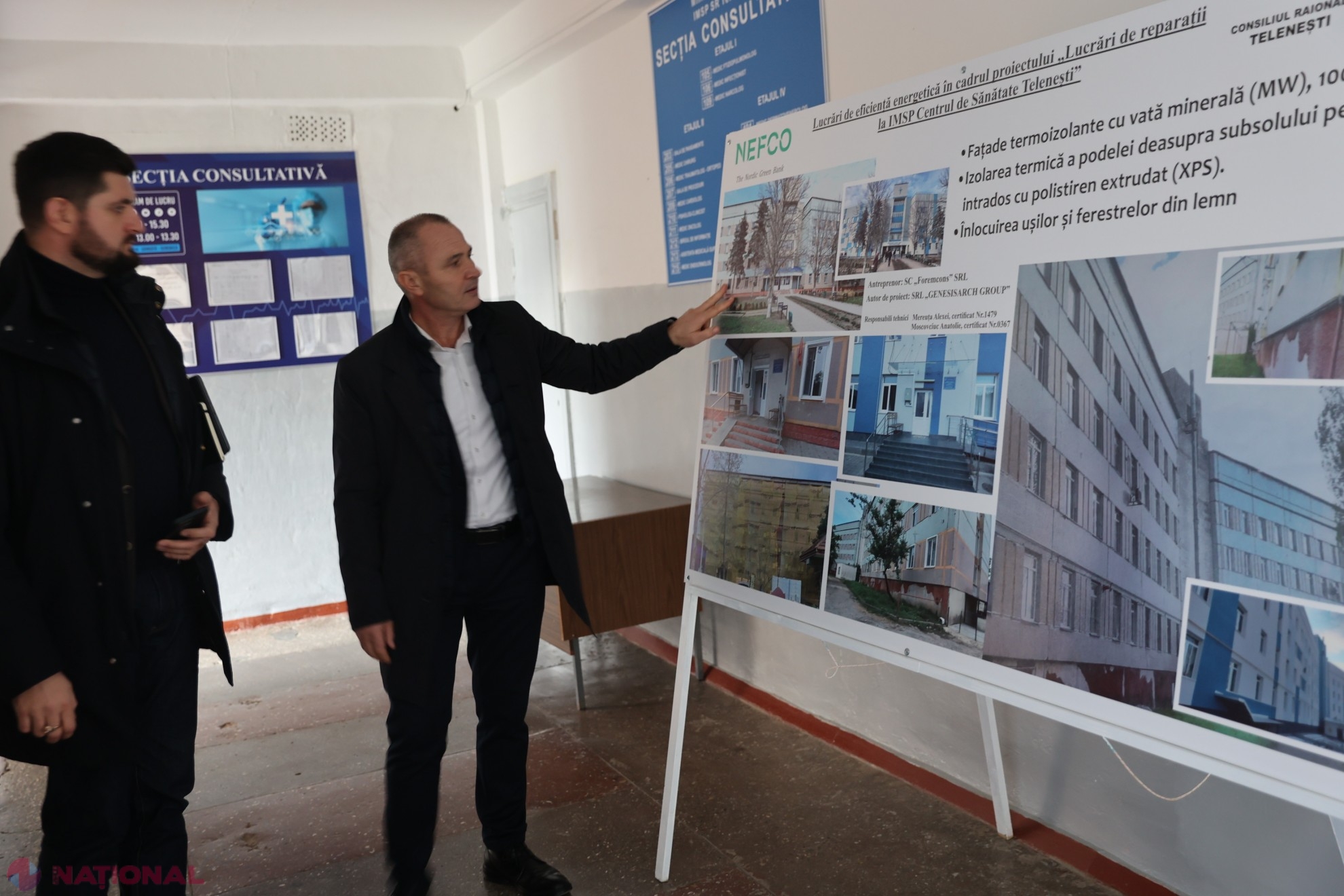 Un moment important al vizitei l-a constituit Centrul de Sănătate Telenești, unde proiectele de eficientizare energetică au fost implementate prin programul NEFCO–E5P (Nordic Green Bank). Valoarea totală a acestor lucrări a fost de 570 000 euro. Au fost efectuate lucrări de izolație termică a fațadelor, podului și subsolului. Acoperișul a fost înlocuit, iar uși și ferestre moderne au fost instalate. De asemenea, un sistem fotovoltaic de 45 kW a fost integrat. Acesta asigură o sursă durabilă de energie. Se anticipează că lucrările de modernizare vor reduce cu 55% consumul de energie termică și cu 63% cel de energie electrică, economisind peste 1,5 milioane lei anual.