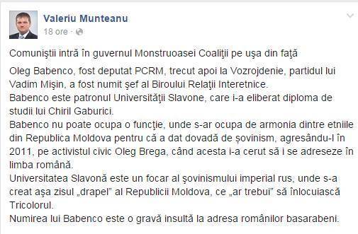 Pe 26 februarie 2015, însă, când liberalii nu făceau parte din coaliția de la guvernare, și Babenco fusese numit în același post de către Guvernul Gaburici, Valeriu Munteanu vorbea despre „coaliția monstruoasă” și despre faptul că comuniștii intrau „pe ușa din față” în Guvern, ceea ce însemna, în opinia dânsului, „insultă gravă la adresa românilor basarabeni”. Numirea lui Babenco a ținut atunci numai o zi, acesta anunțându-și demisia din motive personale.