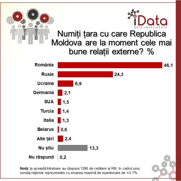 De asemenea, același sondaj arată că R. Moldova are cele mai bune relații externe cu România - 46,1%, urmată de Rusia - 24,3%, Ucraina - 6,9%, Germania - 2,1% și SUA - 1,5 la sută.
