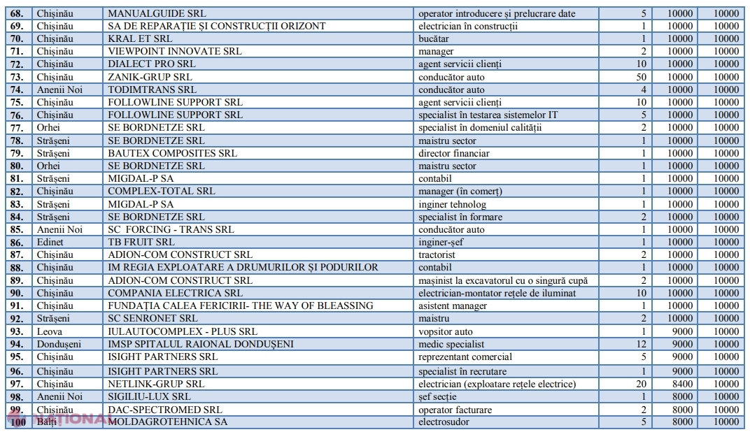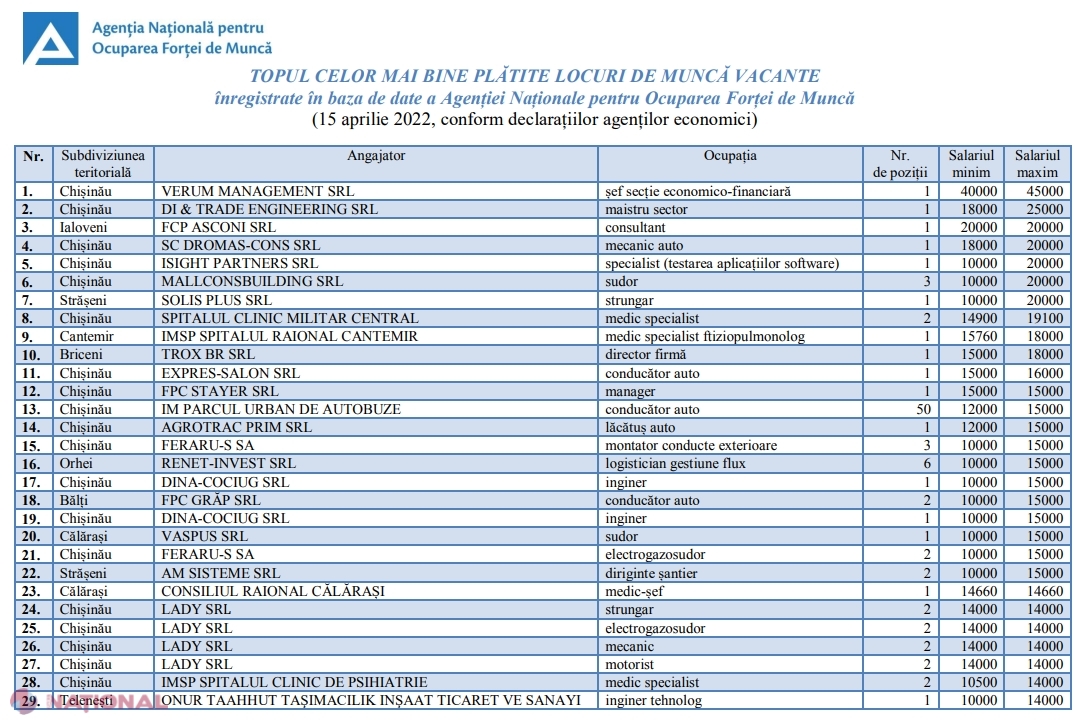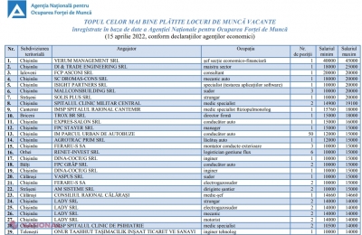 Vedeți mai jos un TOP 100 al celor mai bine plătite posturi vacante de muncă, publicat de ANOFM: