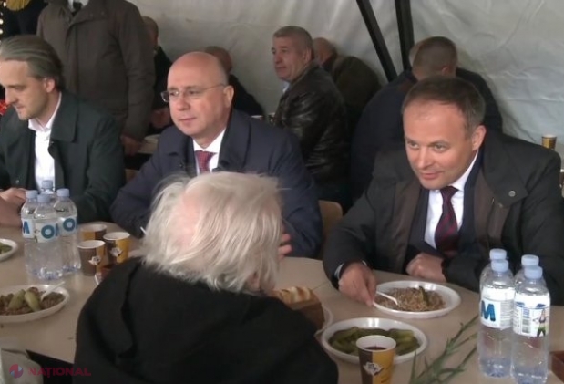 FOTO // Pavel Filip și Andrian Candu, la masă alături de veterani. Aceștia au mâncat terci ostășesc și castraveți murați