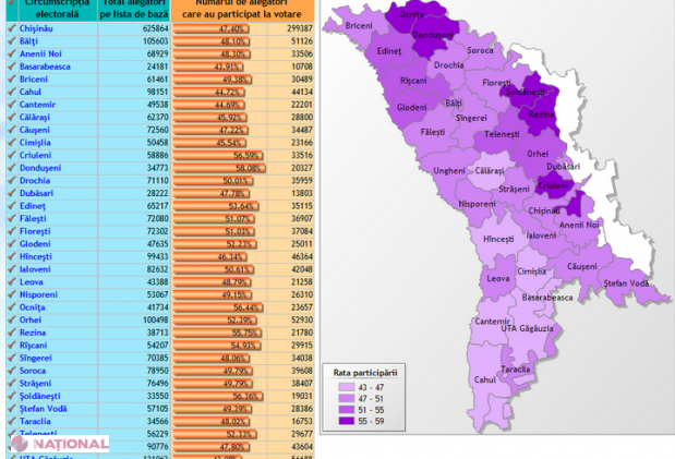 DATE // Nordul a votat MAI MULT ca sudul. Numai în zece raioane au ieșit la urne mai mult de jumătate din alegători