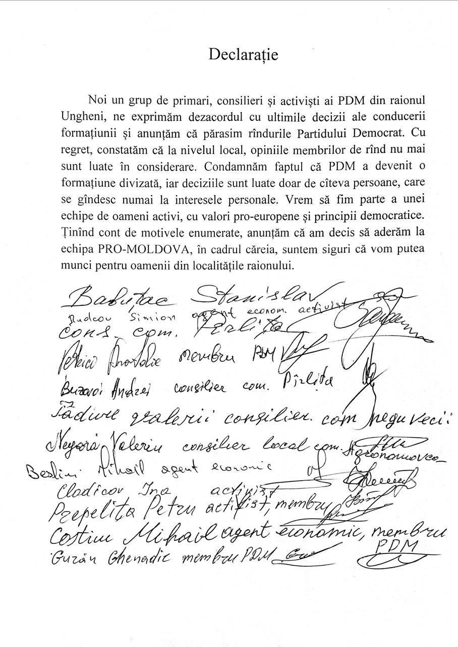 De menționat că „Pro Moldova” a anunțat astăzi că unii aleși locali din Ungehni au aderat la grupul lui Andrian Candu, în semna de protest față de politica promovată în ultima perioadă de PD.