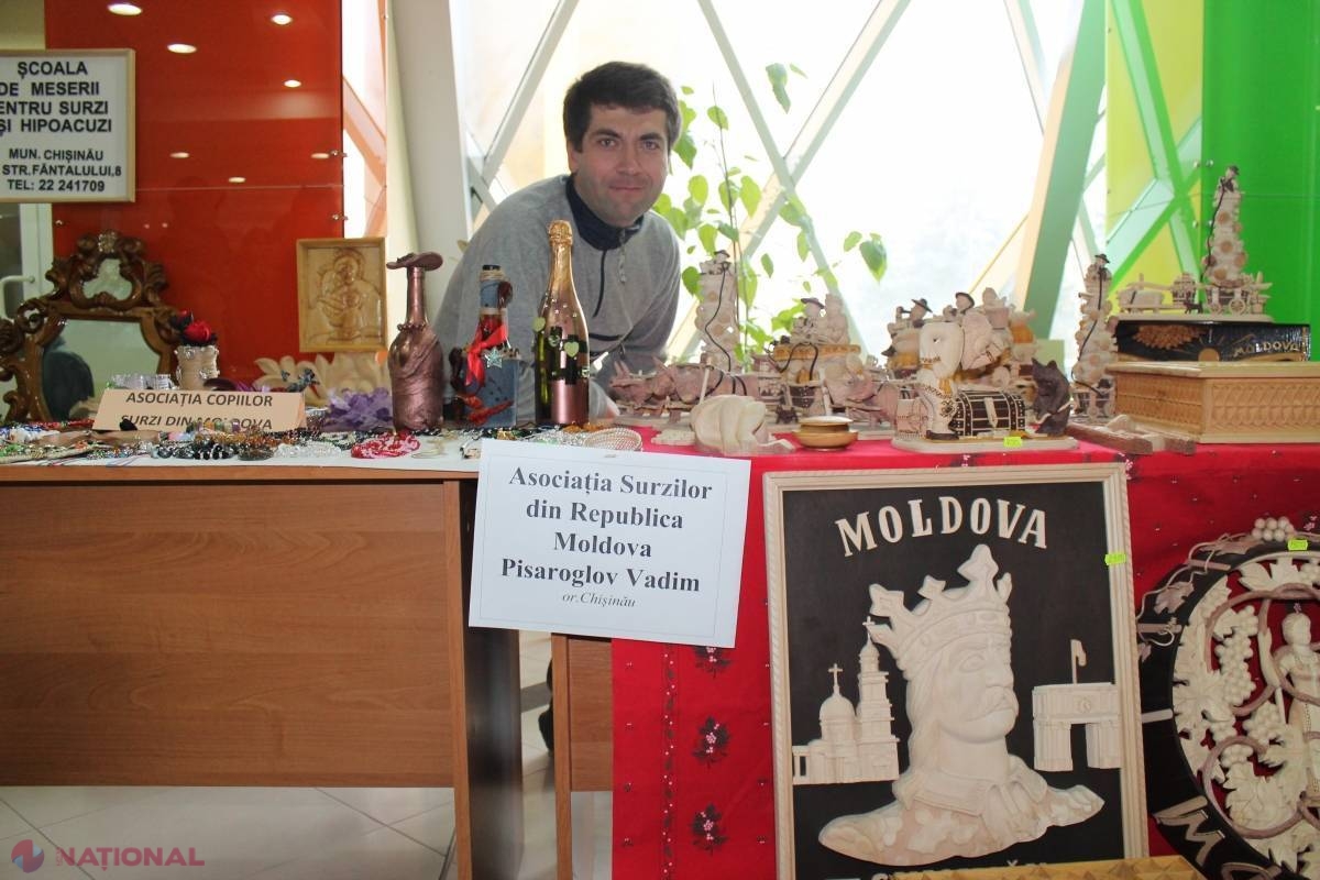 Atât copiii cu sindromul Down, cu deficiențe locomotorii, cât și cei cu deficențe de auz au demonstrat un talent deosebit în arta hand-made. Vadim Pisaroglov nu aude deloc, dar meșterește din lemn icoane, lădițe și suvenire de i s-a dus faima peste hotarele țării. „De la 14 ani am fost pasionat de lemn, iar lucrările mele le mai expun și la piața de lângă Teatrul Național „Mihai Eminescu”. Banii pe care îi câștig îmi ajung să-mi cumpăr materia primă din care confecționez obiectele, dar și de-o pâine. Particip și în cadrul altor expoziții, iar la una dintre ele a cumpărat câteva lucrări prim-ministrul Iurie Leancă”, a spus emoționat Vadim.