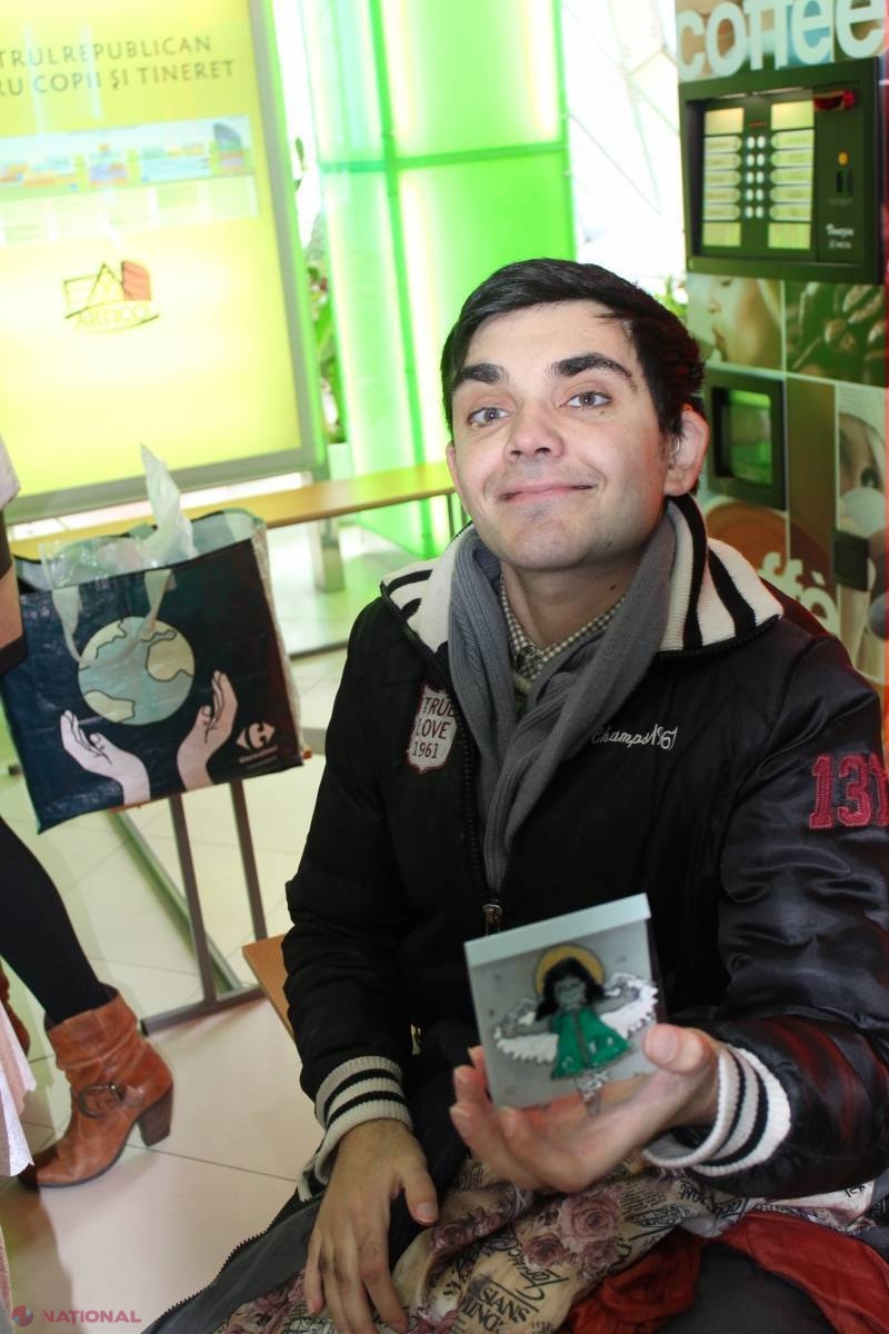 La o altă măsuță, cumpărătorii se îmbulzeau la felicitările confecționate de copiii cu dizabilități locomotorii și cu retard mental. „Am confecționat felicitări pe peliculă. Am nevoie de câteva ore pentru a aduce la bun sfârșit o lucrare. Le vând cu 5 lei, iar cu banii adunați ajut copiii care au mai multă nevoie decât mine”, ne-a spus Paul Vrabie, tânăr cu deficiențe locomotorii.