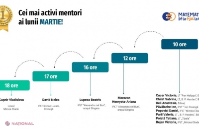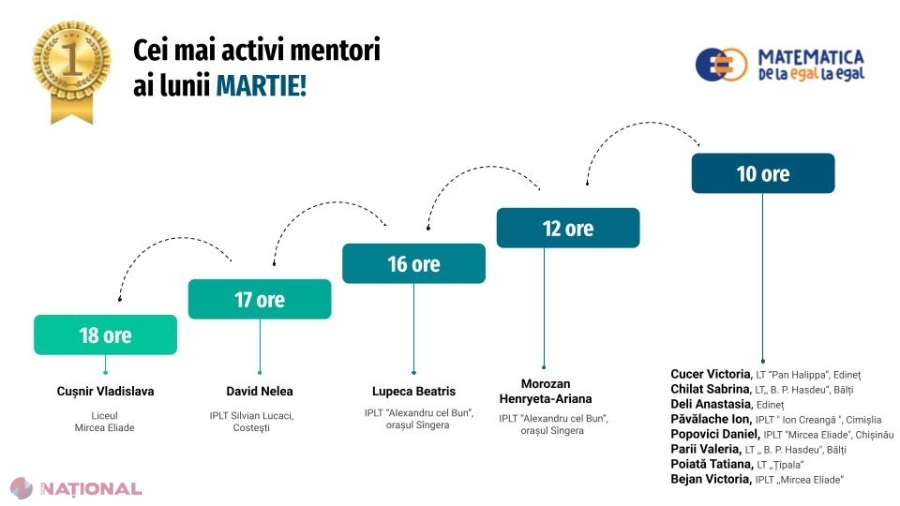 În luna martie, Vladislava Cușnir, de la Liceul „Mircea Eliade” din Chișinău, a acumulat 18 ore de mentorat. Ea a fost urmată de David Nelea, de la Liceul „Silvian Lucaci” din Costești, cu 17 ore, și de Beatris Lupeca, de la Liceul „Alexandru cel Bun” din Sîngera, cu 16 ore. Rezultate remarcabile au fost înregistrate și de Henryeta-Ariana Morozan, de la același liceu, care a acumulat 12 ore, precum și de un grup extins de mentori care au atins câte 10 ore de activitate.