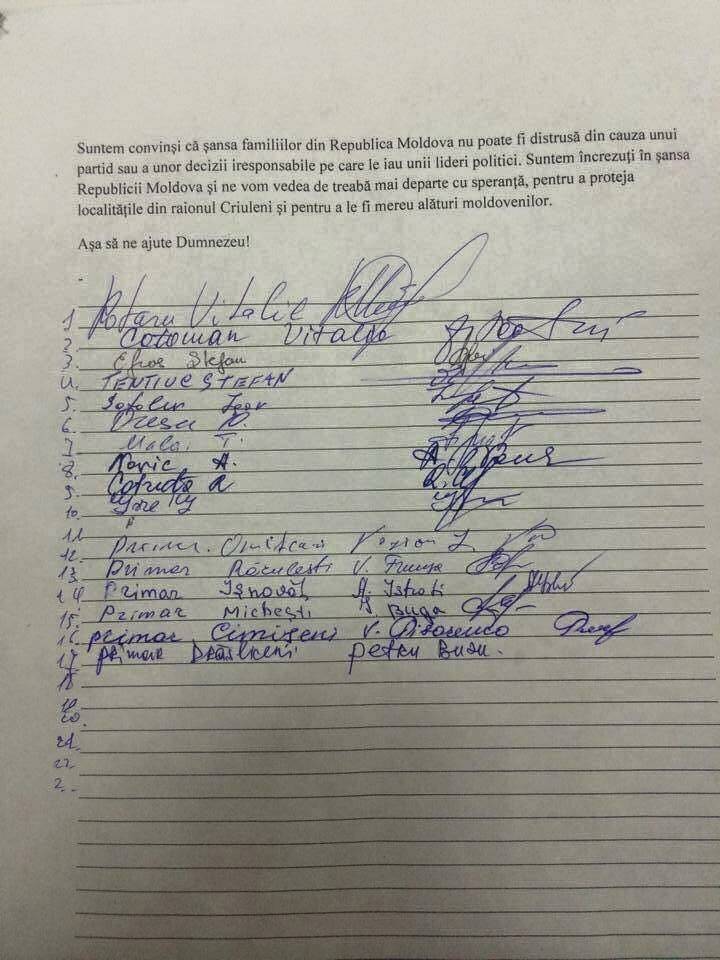 Cazacu afirmă că din cei 16 semnatari doar șapte sunt consilieri raionali, restul au renunțat la mandate. De asemenea, unul dintre primarii indicați, Petru Buzu, primar la Drăsliceni, nu și-a pus semnătura pe declarație.
