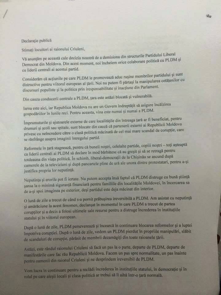 Reformele în țară stagnează, pentru că buneii noștri, celelalte partide, copiii noștri – toți așteaptă ca liderii centrali ai PLDM să declare în mod bărbătesc că au greșit și să se retragă pentru totdeauna din viața politică. În schimb, liberal-democrații de la Chișinău se ascund după camerele de la televiziuni și după pancartele pline de ură ale unora dintre protestatari, pentru a-și justifica propria neputință”, se arată în declarația sub care și-au trecut numele 16 membri ai PLDM, dintre care șase primari și zece consilieri raionali.