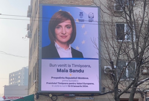 FOTO // Maia Sandu, întâmpinată cu mare fast la Timișoara. Autoritățile locale au plasat pe o clădire un BANNER imens cu poza șefei statului