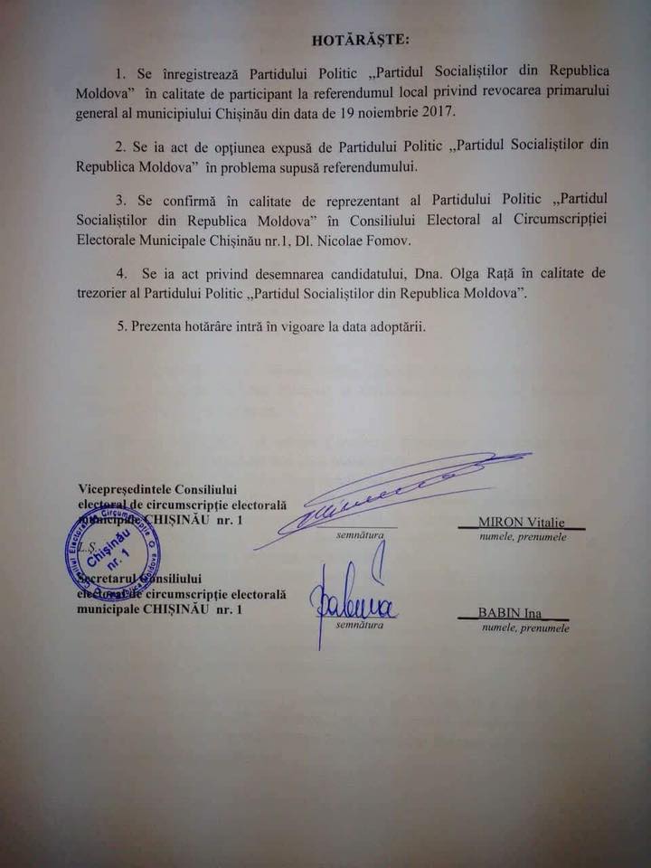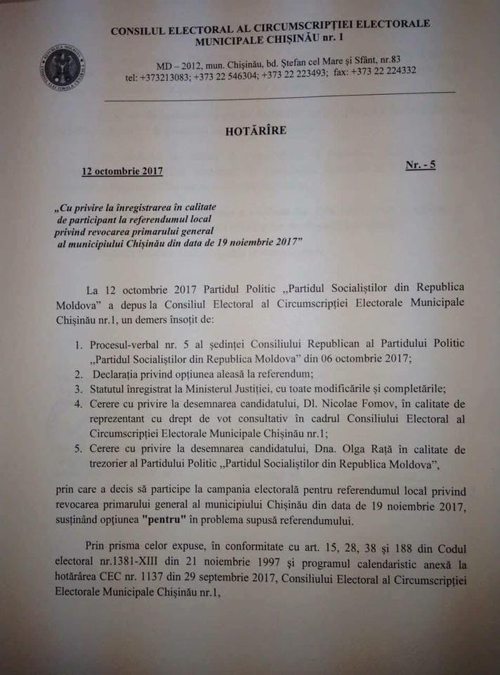 Consiliul Electoral al circumscripției municipale nr.1 a înregistrat, ieri, Partidul Socialiștilor din R. Moldova în calitate de participant la referendumul local privind revocarea primarului general al municipiului Chișinău.