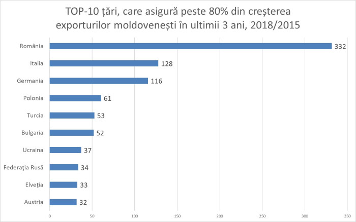 Sursa citată a mai adăugat că exporturile în ultimii trei ani înregistrează o creștere de peste un miliard de dolari. „De fapt, cel mai mult au crescut în 2017-2018. Această creștere în proporție de 55% este asigurat de trei țări: România, Italia și Germania. Dacă exceptăm Italia, Germania, Polonia și Turcia, atunci exporturile spre România au crescut mai mult decât la restul țărilor”, a conchis expertul de la IDIS Viitorul.