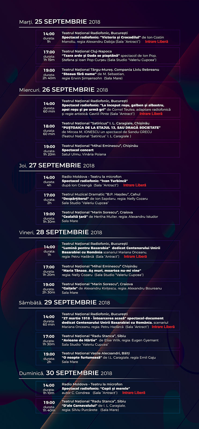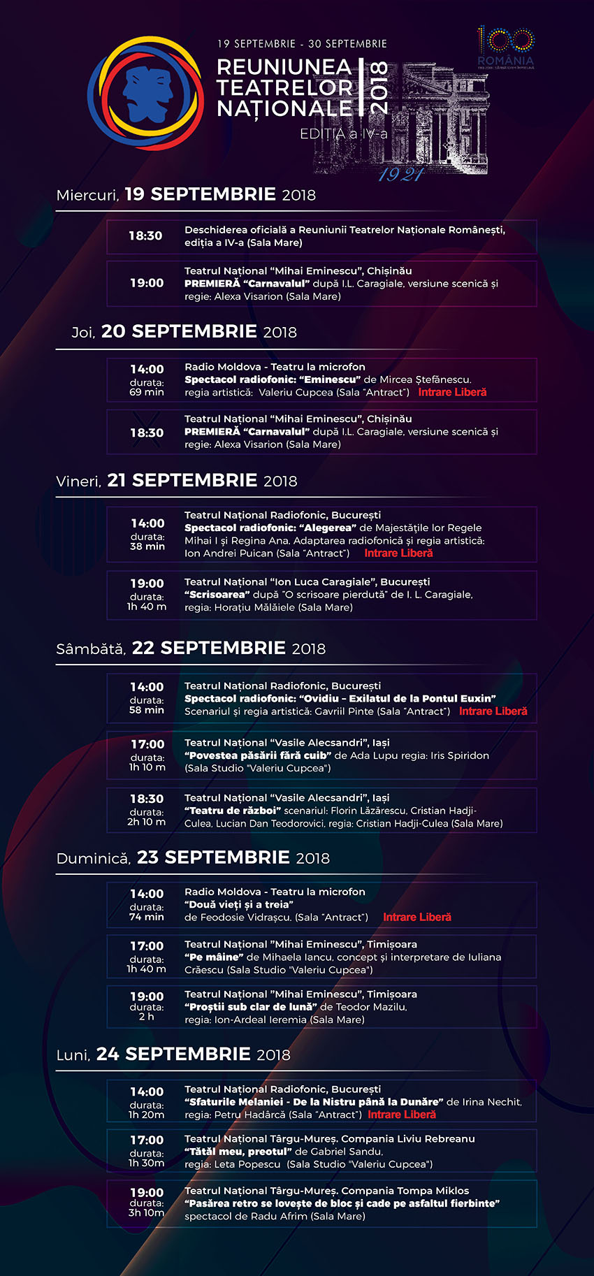 Pe 20 și 21 septembrie, după inaugurarea ediției, vor fi prezentate spectacolele „Regele moare” și „O scrisoare pierdută” montate de Teatrul Național „I. L. Caragiale” din București. Teatrul de la Craiova va juca spectacolele „Gaițele” de Alexandru Kirițescu și „Cealaltă țară” de Herta Muller, deținătoare a Premiului Nobel. Teatrul de la Sibiu va prezenta spectacolele „Avioane de hârtie” și „D-ale Carnavalului” de Ion Luca Caragiale, iar cel din Târgu Mureș - spectacolul „Steaua fără nume” de Mihail Sebastian.