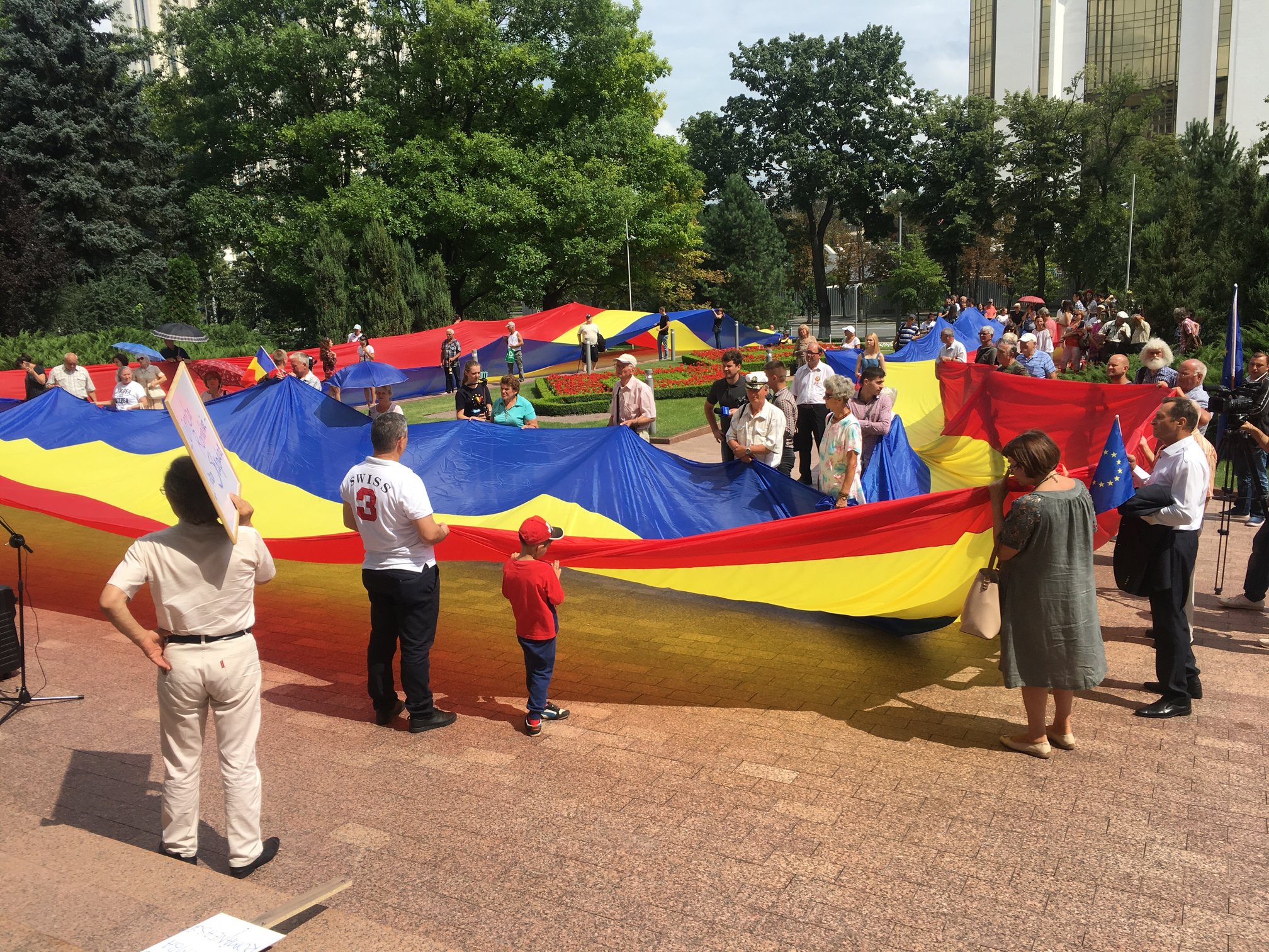 UNIREA-ODIP Cu pancarte și un tricolor imens de 100 de metri lungime, zeci de unioniști s-au adunat, astăzi, pe 29 iulie, în fața Parlamentului, pentru a cere deputaților să modifice articolul 13 din Constituție, astfel încât sintagma de „limba moldovenească” să fie înlocuită cu „limba română”.