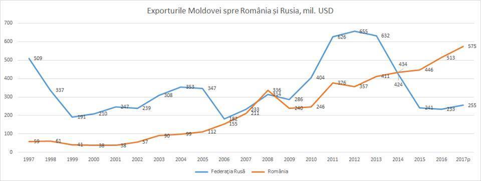 „România înregistrează cea mai mare performață în exporturile din R. Moldova. Volumul exporturilor spre România din acest an, ca și anul trecut, sunt cele mai mari, comparativ cu restul țărilor. Această creștere consolidează și mai mult poziția de lider a României în comerțul nostru extern, pe care ea îl deține deja al patrulea an consecutiv”, constată expertul de la IDIS „Viitorul”, Veaceslav Ioniță.