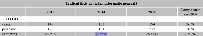 În total, anul trecut au fost descoperite 191 de tentative de contrabandă cu țigări, față de 178 câte au fost în 2014. Pe de altă parte, cantitatea țigărilor confiscate este mai mică: 280 414 pachete față de 405 338 de pachete de țigări găsite în anul 2014.